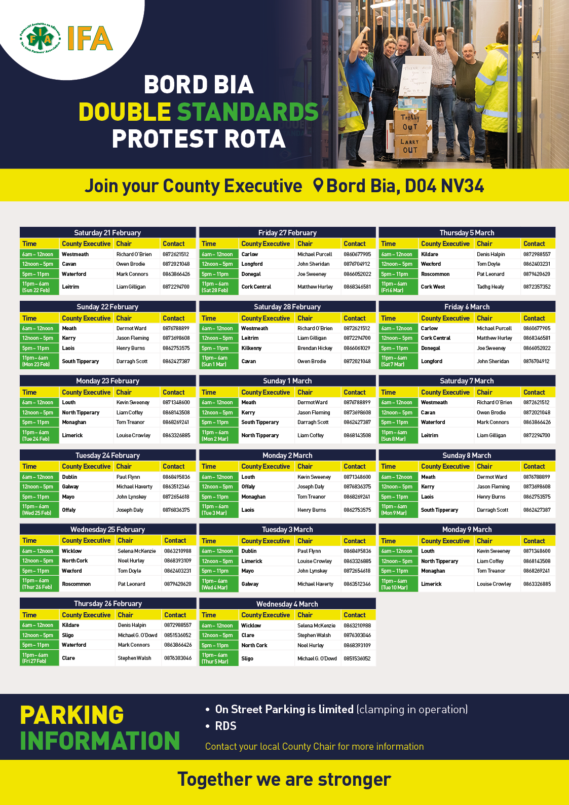 All IFA County Chairs / Executives are asked to take charge of their allocated time slots, coordinate attendance and ensure carloads of members are organised.