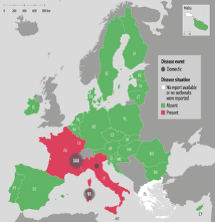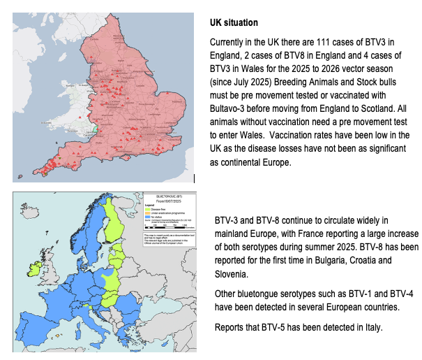 Bluetongue serotype 3 (BTV-3) was detected in the Netherlands in 2023 and has successfully overwintered in several countries in 2023 and 2024. A new serotype BTV-12 has been detected in The Netherlands in October 2024 with one case detected in the UK in February 2025. Genetically, it is unrelated to BTV-3 with its origins currently unknown. Other strains of Bluetongue stereotypes, BTV-4 and BTV-8, continue to circulate in other European countries with BTV-5 recently detected in Italy. A more virulent strain of BTV-8 emerged in France in August 2023 with cases in France and Spain in 2024 and 2025. This strain has more saver health implications with a high mortality rate amongst sheep flocks. There are approved vaccines available for both BTV4 and BTV-8 with different approaches being taken on the administration and cost burden in different countries.