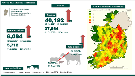 There is an increase in BVD rates year on year with some large breakdown on farms this spring. The reduction in disease prevalence and vaccination has led to increasingly naive herds. DAFM must ensure that there are increased levels of vaccination available for farms surrounding outbreaks. Irish farmers have worked to reduce this disease to near eradication, and this progress must be protected. In 2025 DAFM provided €3.75 million equating to €2.40 per calf for a max of 25 calves.