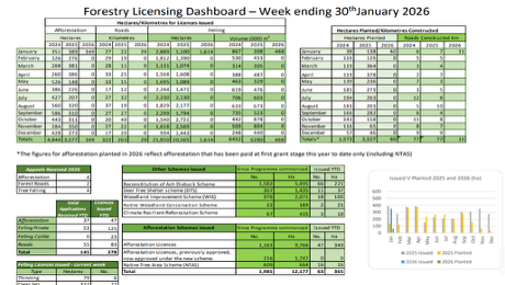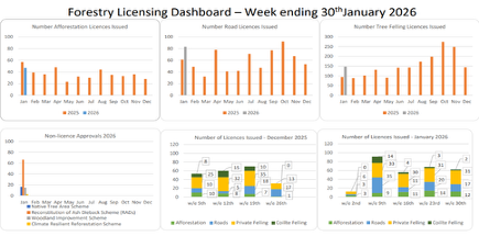 The Forestry Weekly Dashboard showed that as of the end of January, 349 hectares of new forest have been planted and 29km of forest roads constructed. Afforestation licences issued to establish 8,766 hectares under the Afforestation scheme and 664 hectares under the Native Tree Area scheme. 125private felling licences issued compared with 23 Coillte felling licences.
